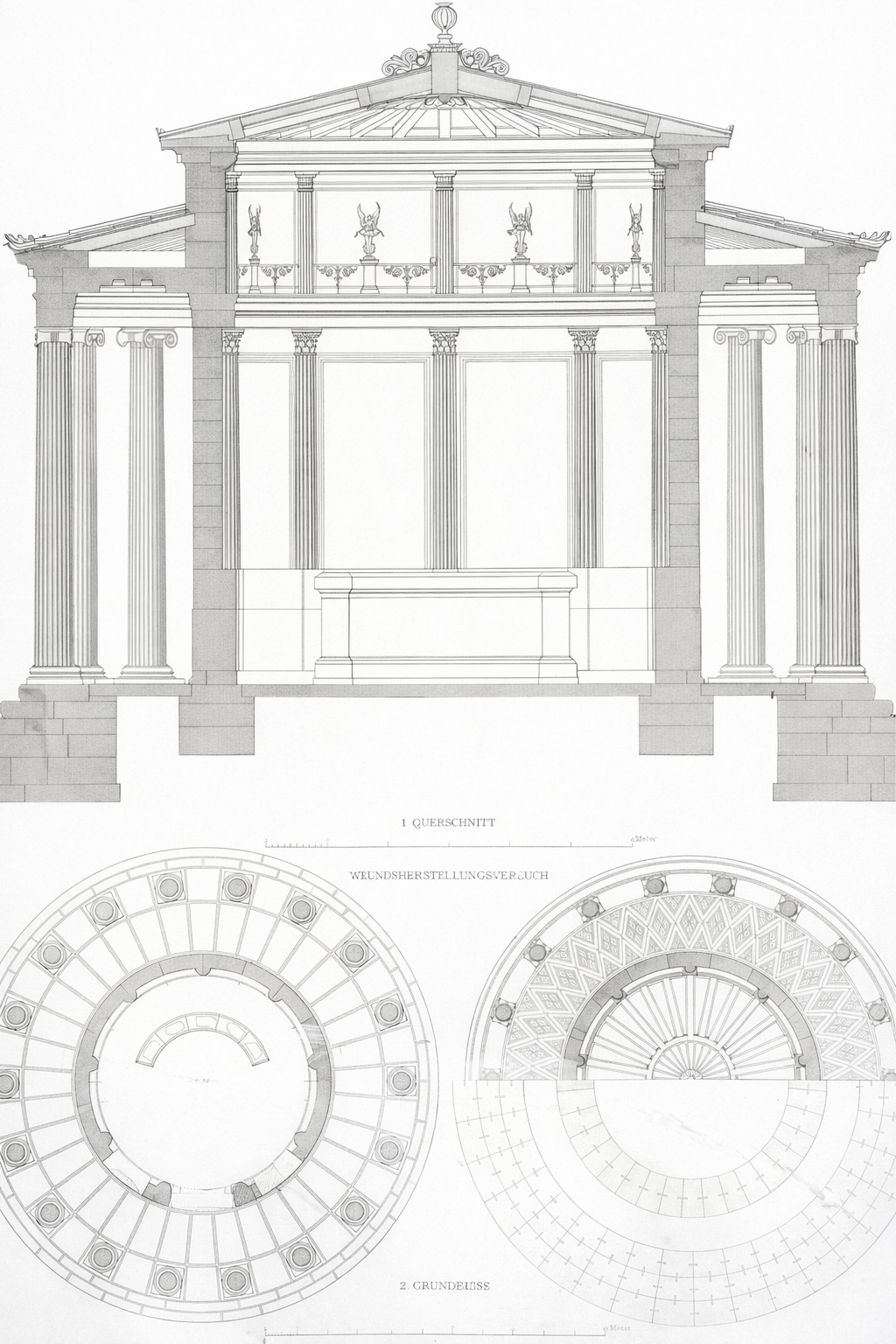 The exterior featured eighteen (18) Ionic columns standing on a three-stepped marble base (crepidoma).