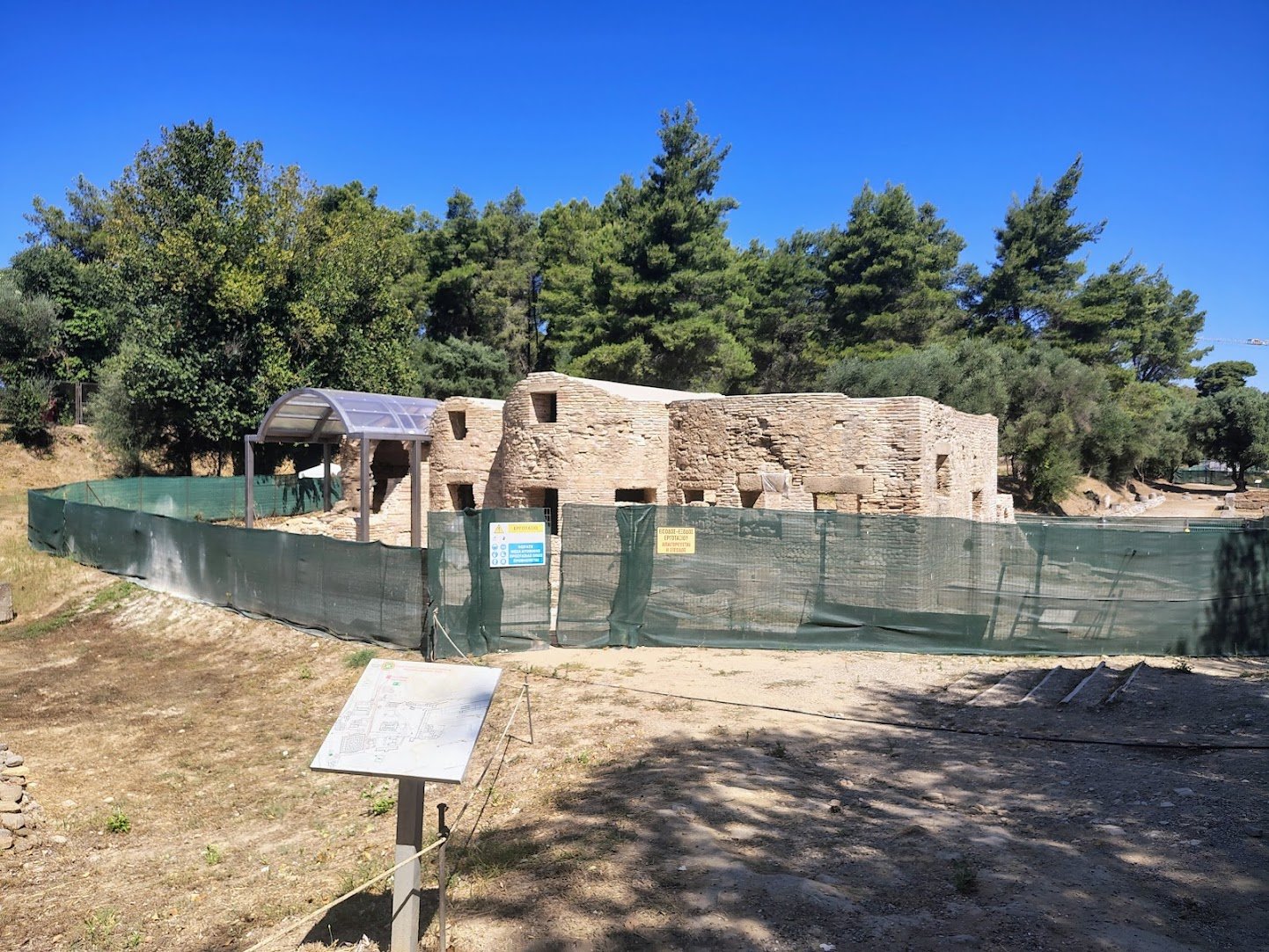 Τμήματα γεωμετρικών μωσαϊκών δαπέδων έχουν διατηρηθεί και προστατεύονται εντός του αρχαιολογικού χώρου.