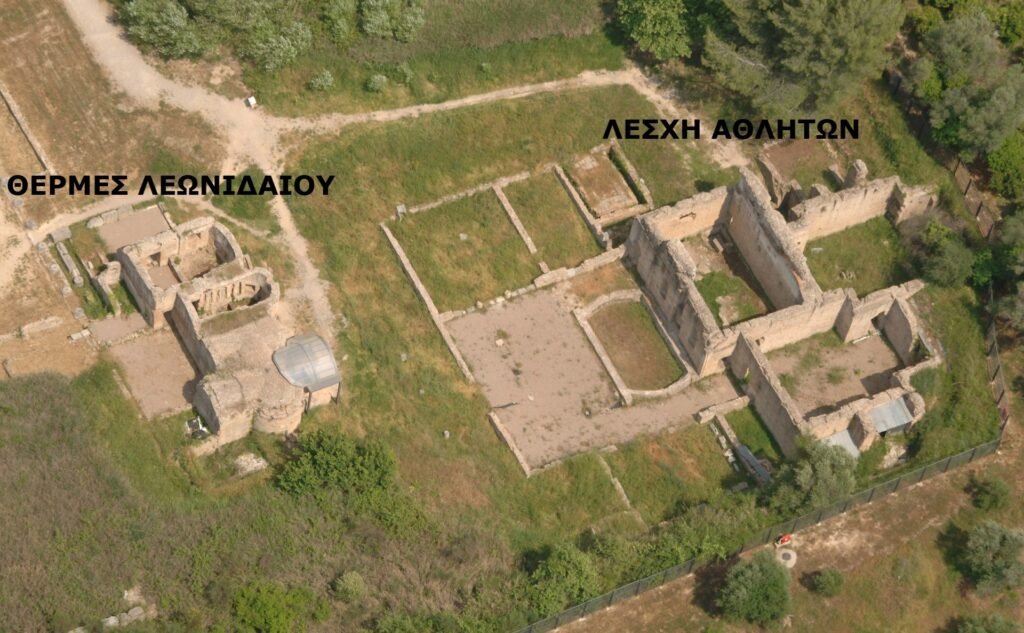 Το συγκρότημα των λουτρών ενσωματώθηκε στρατηγικά στη νοτιοανατολική γωνία του τεράστιου περιστυλίου του Λεωνιδαίου.