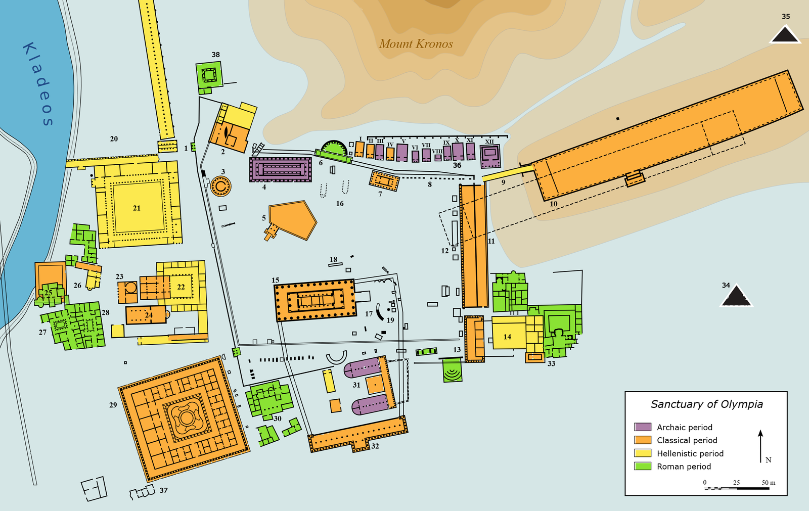 Οι βασικές θρησκευτικές δομές της Ιερής Άλτης, συμπεριλαμβανομένων ναών, βωμών, ιερών ηρώων και αφιερωμάτων νίκης