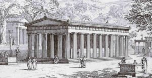 The Temple of Zeus at Olympia, designed by Libon of Elis (ca. 470–456 BC), was the grandest expression of Doric architecture in the Peloponnese. Within its cella stood Pheidias’ colossal statue of Zeus, made of gold and ivory, one of the Seven Wonders of the Ancient World.