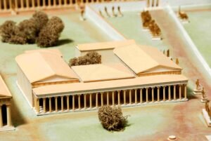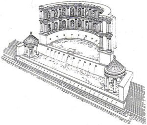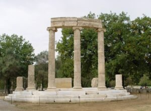 The Philippeion, built by Philip II of Macedon and completed by Alexander the Great, was a circular temple in Olympia dedicated to their dynasty. Its Ionic colonnade and chryselephantine statues by Leochares made it one of the sanctuary’s most refined monuments, blending political power with sacred symbolism.