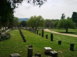 The Echo Hall was a long colonnaded stoa renowned for its seven-fold echo. Located near the stadium entrance, it provided shelter, acoustic performance space, and impressive architectural framing within the Altis.