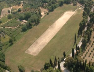 The Stadium of Olympia, built to host the ancient Olympic Games, could hold up to 45,000 spectators. Its 192.27-meter track and the vaulted Krypte passage still convey the grandeur of a space where athletic performance met religious devotion.